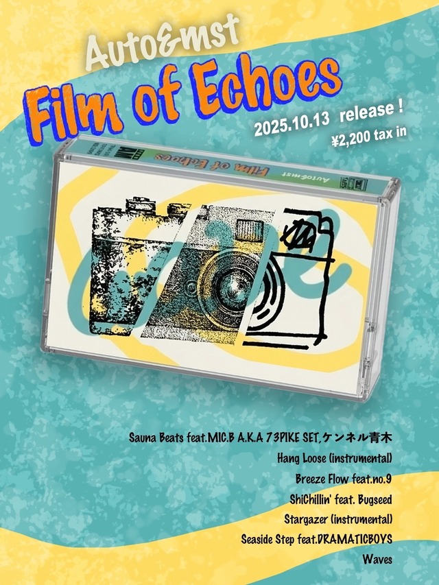Auto&mst 『Film of Echoes』 カセットテープ 試聴 https://bananamusic.jp/contents/310218 A side 1 Sauna Beats feat.MIC.B A.K.A 73PIKE SET , ケンネル青木 2 Hang Loose (instrumental) 3 Breeze Flow feat. no.9 4 ShiChillin' feat. Bugseed B side 5 Stargazer (instrumental) 6 Seaside Step feat.DRAMATICBOYS 7 Waves リリース日程:2025/10/13 Artwork:unomori Mastering: Studio GreenHouse Label:TAPES / TENT Sound System Auto&mst が、7曲入りEP 「Film of Echoes」 を10月13日、CASSETTE WEEK JAPAN 2025 にてリリース予定。 「空気感の記録」をテーマにした本作は、日常の隙間に漂う温度や気配、そして残響をそのまま磁気テープに封じ込めたような作品。 オープニングを飾る M1「Sauna Beats」 は、ケンネル青木による空中に溶けるようなスティールパンの旋律と、MIC.BのTalk Boxが織りなす歌声が心地よく混ざり合い、サウナのようなとろける安らぎを描く。 M3「Breeze Flow」 では、作曲家 no.9 が幾層にも重ねた音のレイヤーを用い、一つの旋律を立体的に構築。複雑な構成ながら、聴き心地は驚くほど滑らかでシンプルに響く。 M4「ShiChillin'」 は、ビートメイカー Bugseed が参加。ローエンドのビートと重心の低いベース、そしてDUB処理された上音が揺らめくように共鳴し、穏やかな多幸感を誘う。 M6「Seaside Step」 には、DJユニット DRAMATIC BOYS が参加。藤沢のチルアウト酒場「常夏」で繰り広げられる夜のパーティを思わせる、陶酔的なグルーヴが広がり、自然と身体が動き出す。 『Film of Echoes』は単なる楽曲集ではなく、「その場に流れていた空気そのもの」をパッケージした音の記録フィルム。 聴くたびに、その瞬間の情景や心情を呼び覚ます体験をもたらす。Auto&mstによる、生演奏のドリーミーでメランコリックな音像と、サンプリングを駆使した有機的なビートが融合した、唯一無二の作品となっている。